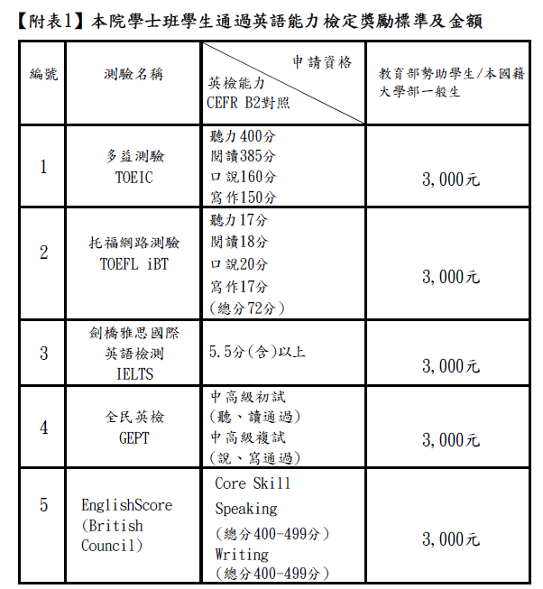 • 若報考其他英語能力檢定,則補助金額依『本院學士班學生通過英語能力檢定獎勵標準及金額』表核定。
